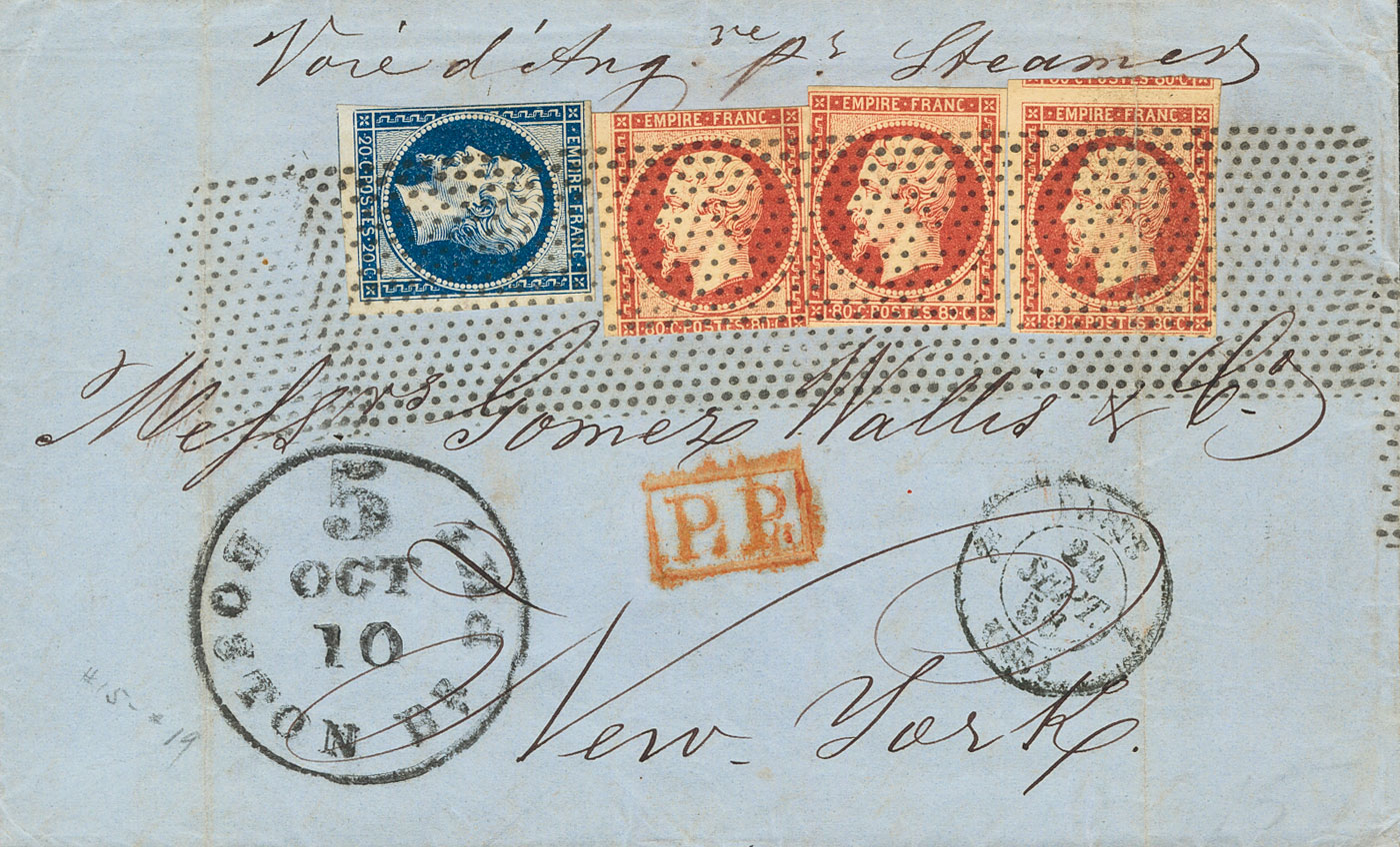 Yvert 14A, 17A(3). 1856. 20 cts azul Tipo I y 80 cts carmín, tres sellos. PARIS a NUEVA YORK (USA). Matasello POINTILLE. MAGNIFICA Y RARA.