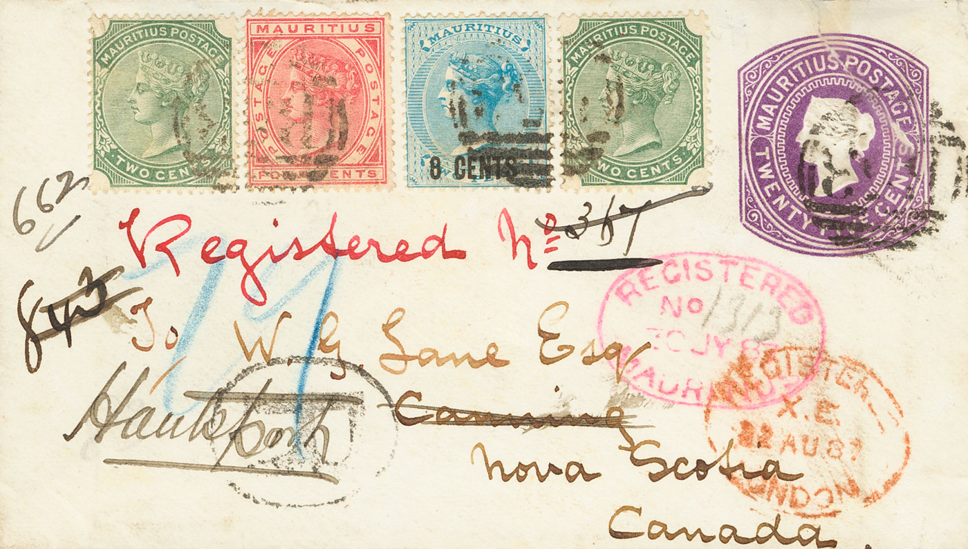 Yvert 49, 69(2), 71. 1887. 25 cts violeta sobre Entero Postal (pequeño corte sin importancia) con franqueo complementario de 8 cts sobre 2 p azul, 2 cts verde, dos sellos y 4 cts rosa Certificado de PORT LOUIS a CANNING (NUEVA ESCOCIA), y reexpedida a HAKFORT. MAGNIFICA Y ESPECTACULAR FRANQUEO.