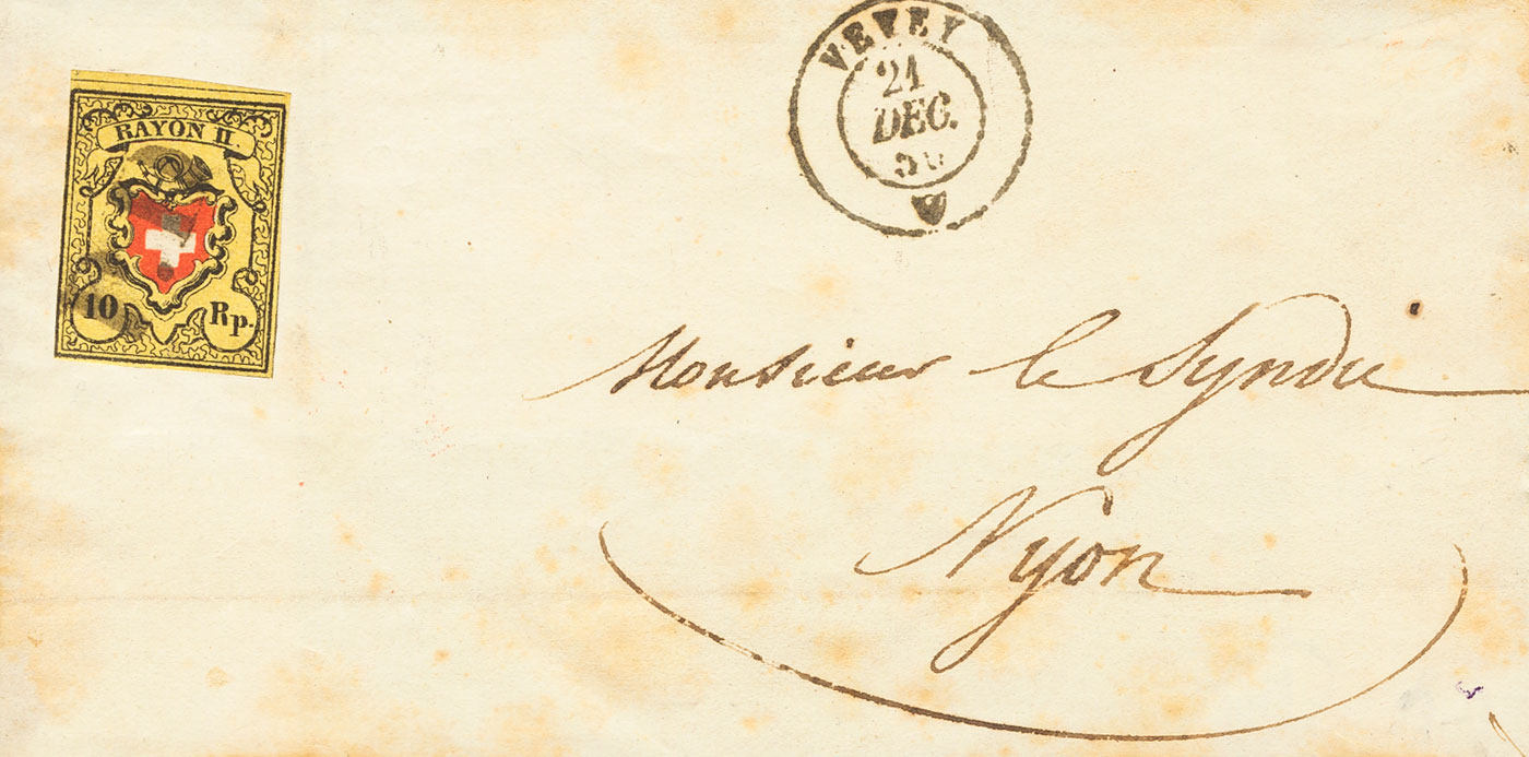 Yvert 15. 1850. 10 rp amarillo, negro y rojo. VEVEY a NYON (carta algo tonalizada). Matasello P.D. BONITA Y RARA.