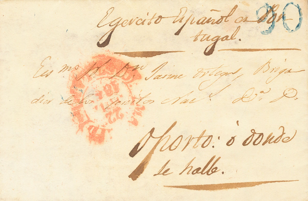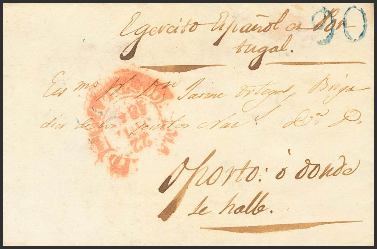 1847. MADRID a OPORTO (PORTUGAL). Dirigida al Brigadier Jaime Ortega del Ejército Español en Portugal en "Oporto o donde se halle". La guerra civil enfrenta en Portugal al gobierno conservador de Doña MarÃa II y a la Junta Progresista de Oporto. Tras una mmediación hispano-británica fracasada, se acuerda en Londres la intervención militar en apoyo de la reina. En Madrid se concretan los detalles de la participación española con el envÃo de un ejército de operaciones al mando del general Manuel Gutiérrez de la Concha. Con la firma del Convenio de Gramido suscrito por el general español, finaliza la guerra civil. MAGNIFICA Y UNICA CONOCIDA, DOCUMENTO DE EXCEPCIONAL VALOR HISTORICO.