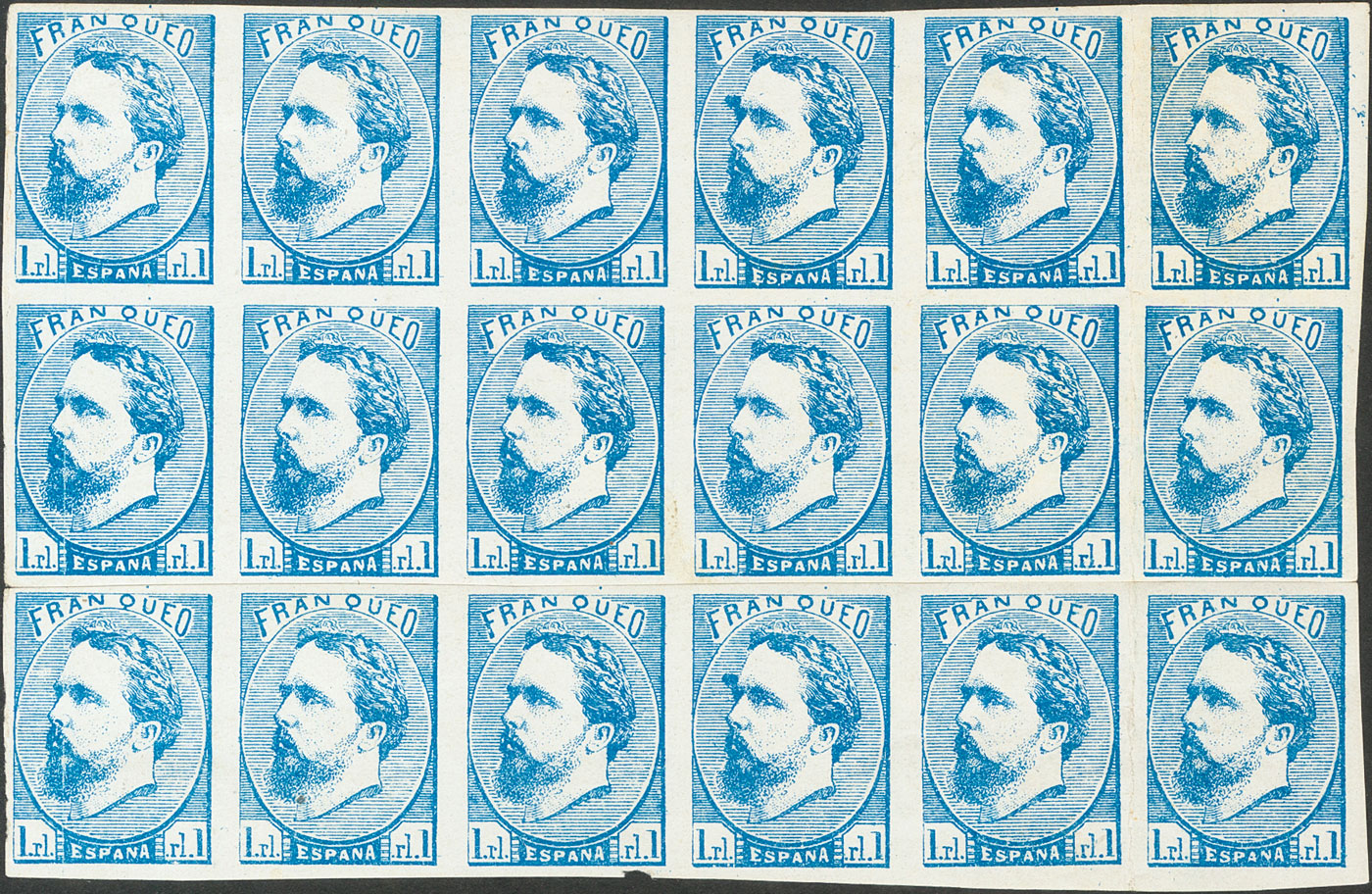 ★ 156A(18). 1873. 1 real azul, bloque de dieciocho correspondiente a los tipos 94-99, 105-110 y 116-121 (la fila inferior perteneciente al bloque original unida con fijasellos, algún defectito sin importancia en un bloque de este tamaño y rareza). MAGNIFICO Y ESPECTACULAR BLOQUE, SE TRATA SIN DUDA DE UNO DE LOS MAYORES BLOQUES CONOCIDOS. Cert. EXFIMA. Ex-Alfaro.