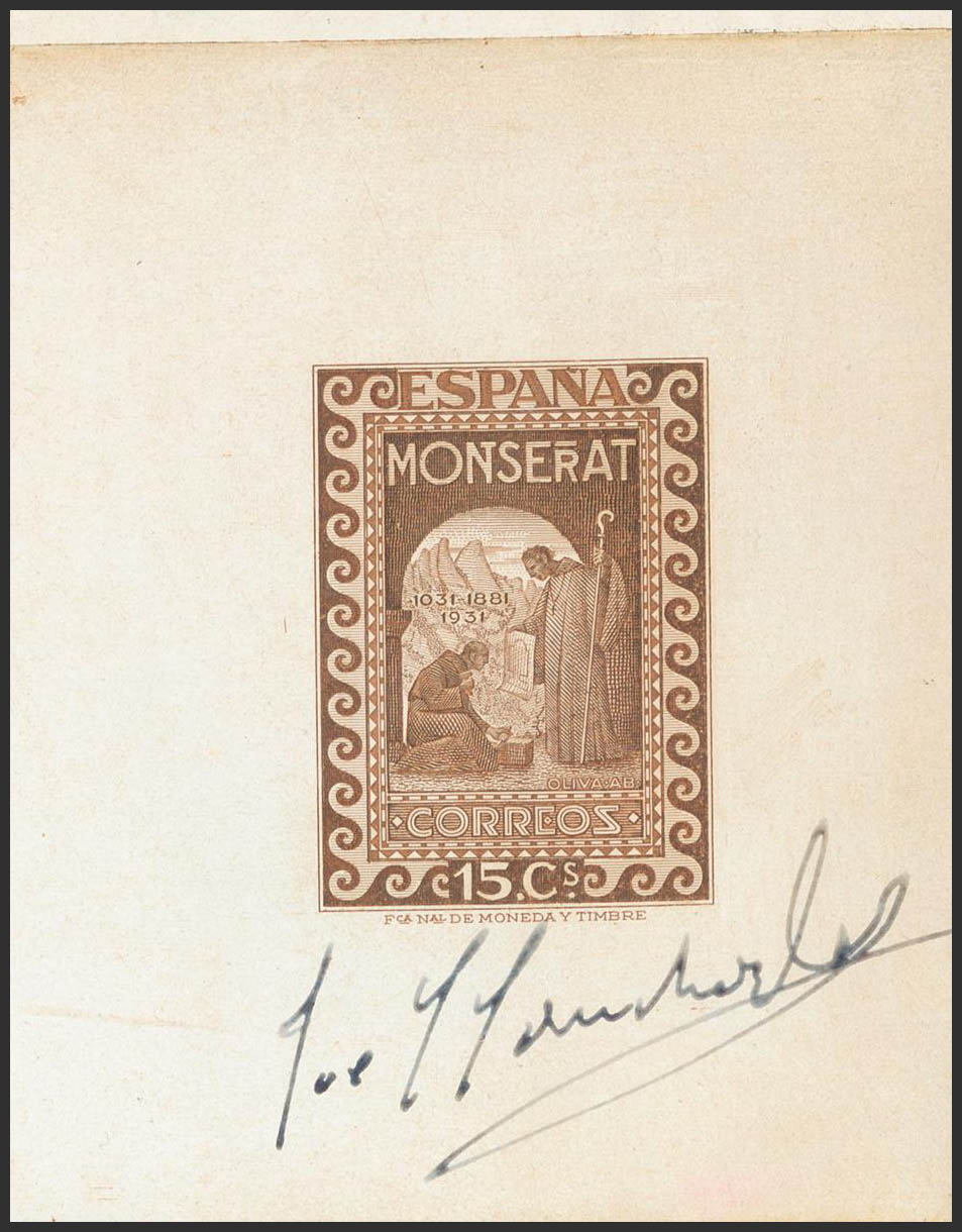(★) 640P. 1931. 15 cts castaño. PRUEBA DE PUNZON, firmada por el grabador J.L. Sánchez Toda. MAGNIFICA Y RARISIMA.
