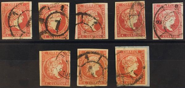 52F(4). 1860. Conjunto de cuatro sellos (con diferentes tonalidades) del 4 cuartos amarillo FALSO POSTAL TIPO VII, utilizado en Lérida. MAGNIFICO.