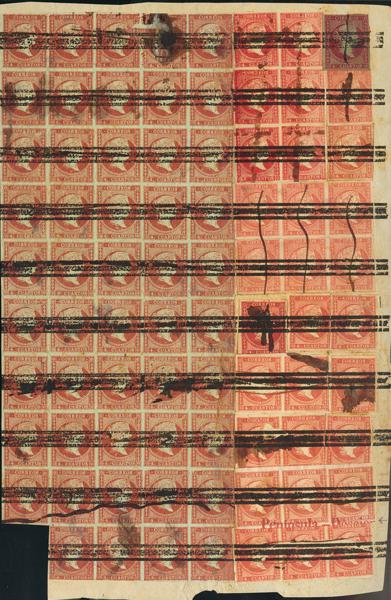 102Fs. 1883. 10 ctvos castaño FALSO POSTAL (sin dentar), bloque de noventa sellos (alguno con defecto sin importancia). Anulados con marca del Juzgado de 1ª Instancia de La Habana. MAGNIFICO Y RARO CON EL ERROR DE 5 CTS YA CORREGIDO.