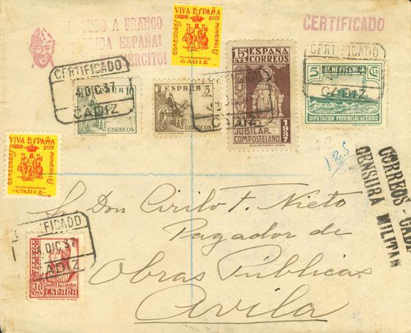 991, 922, 941(2). 1941. 4 pts rojo, 20 cts lila y 25 cts carmÃn, dos sellos. Certificado de OVIEDO a FRIBURGO (SUIZA). Al dorso tránsito MADRID. MAGNIFICA.