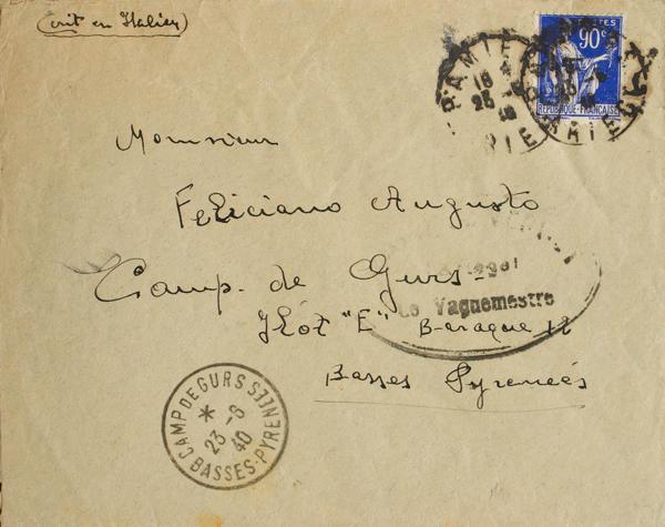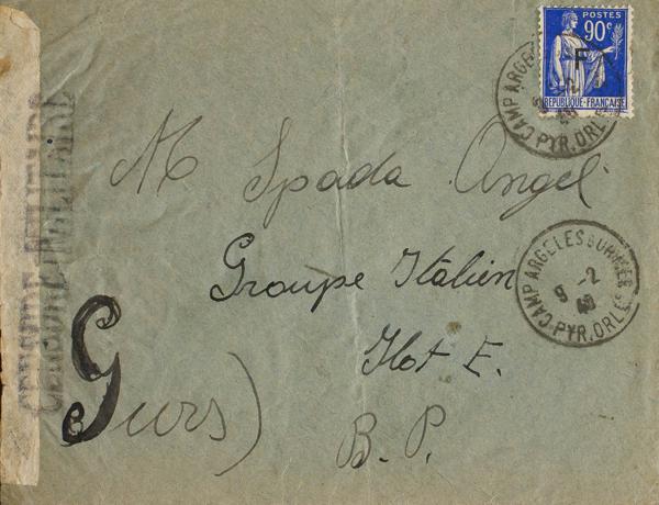 1940. 90 cts azul de Francia con sobrecarga "F". ARGELES SUR MER a GURS, remitida desde el Campo de Argeles y dirigida al Campo de Gurs, remitida por Ada Grossi y dirigida a Carmine Cesar Grossi, su marido, conocido abogado antifascista afincado en Barcelona que terminó en un campo disciplinario como el de Gurs por su campaña contra Franco a través de su emisora de radio de Barcelona. MAGNIFICA Y RARISIMA CIRCULADA ENTRE DIFERENTES CAMPOS.