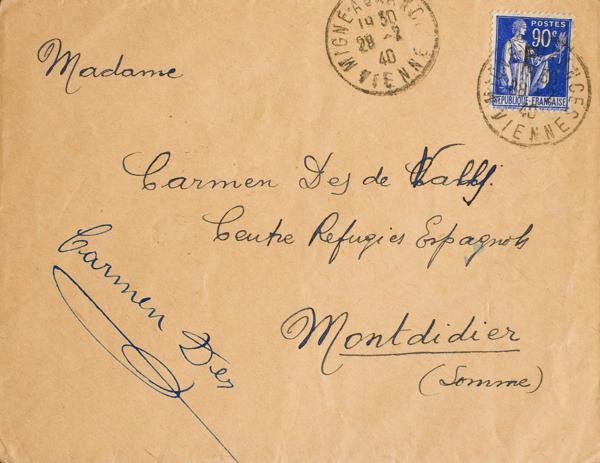 1940. 90 cts azul de Francia con sobrecarga "F". MIGNE AUXANCES a MONTDIDIER (FRANCIA). En Migne Auxances estaban ubicadas las CompañÃas de Trabajadores Extranjeros CTE 96, 97, 98 y 99, y en Montdidier se ubicó una pequeña colonia de refugiadas españolas. MAGNIFICA Y RARA CORRESPONDENCIA ENTRE CAMPOS DE CONCENTRACION.