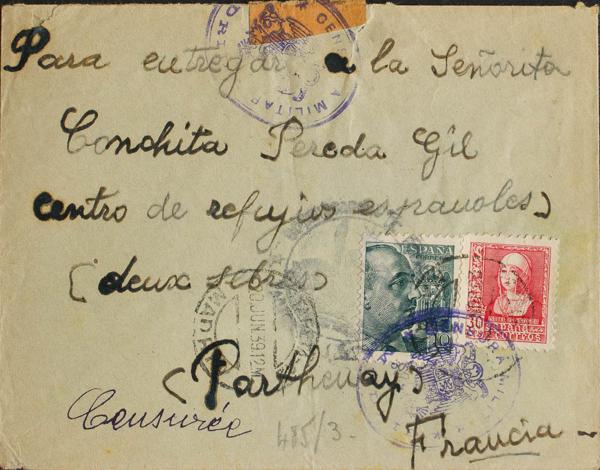 874(2). 1939. 70 cts azul, dos sellos. Certificado de MANRESA a PARTHENAY (FRANCIA), dirigida al Campo de Refugiados españoles. En el frente marca CENTRE DES REFUGIES / DE PARTHENAY / DEUX SEVRES, en violeta. MAGNIFICA Y RARISIMA.