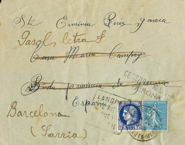 1940. 50 cts azul claro y 1´75 cts azul sellos de FRANCIA. LANGRES a BREDA (GERONA), y reexpedida a BARCELONA. Escrita en el Campo de Internamiento de Langres (Frontstalag 123). MAGNIFICA Y RARA.