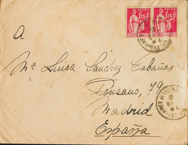 1940. 1´25 fr rosa, dos sellos de Francia. ARGELES SUR MER (FRANCIA) a MADRID (Remitida por un refugiado español de la 143 C.T.E. (compañÃa de trabajadores españoles) del Campo de Argeles Sur Mer). MAGNIFICA Y RARA.