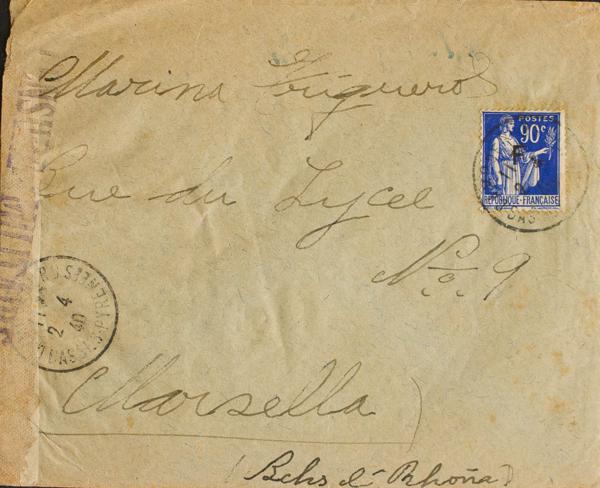 1940. 90 cts azul de Francia con sobrecarga "F". GURS a MARSELLA (FRANCIA), remitida por un internado del grupo cubano de la CompañÃa 257. Matasello CAMP DE GURS / BASSES PYRENEES. MAGNIFICA Y RARA.