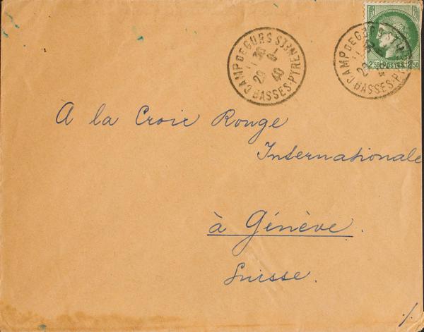 1940. 2´50 fr verde de Francia. GURS a GINEBRA (SUIZA). Matasello CAMP DE GURS / BASSES PYRENEES. MAGNIFICA Y RARA.