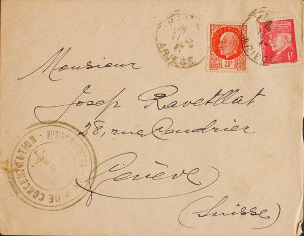 1940. 1 f rosa y 3 f naranja. LE VERNET A GINEBRA (SUIZA) (remitida por un interno español). El Campo de Internamiento de Vernet se convirtió en Campo de Concentración o disciplinario para españoles y extranjeros extremistas, en el frente marca CAMP DE CONCENTRATION / VERNET / D´ARIEGE. MAGNIFICA Y RARA.