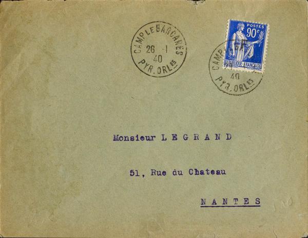 1940. 90 cts azul de Francia, sobrecarga F. LE BARCARES a NANTES. Matasello CAMP LE BARCARES / PYR.ORLES (al estallar la II Guerra Mundial fue puesto bajo la autoridad militar del Gobierno de Vichy y empleó el Campo como punto de concentración de CompañÃas de Trabajadores Extranjeros tales como la G.T.E. o la C.T.E.). MAGNIFICA.