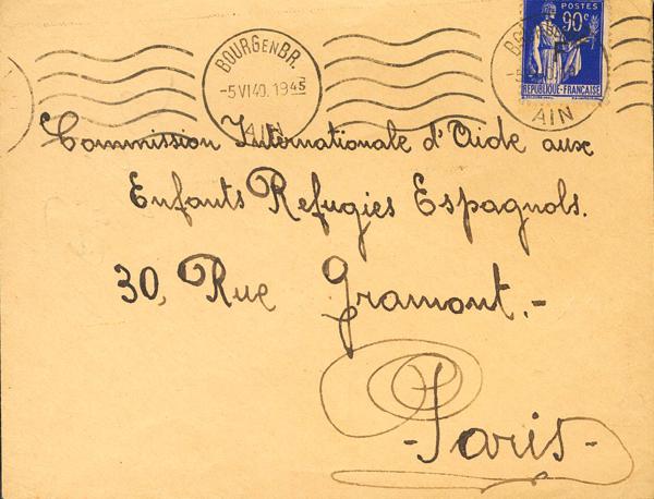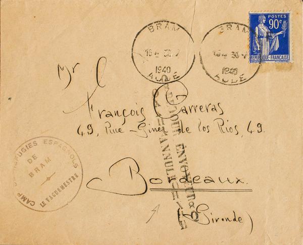1940. 90 cts azul de Francia, sobrecarga F. BRAM a BURDEOS (escrita por un español internado en el Campo de Bram). Matasello BRAM / AUDE y en el frente marcas CAMP DE REFUGIES ESPAGNOLS / DE BRAM LE VAGUEMESTRE y RETOUR ENVOYEUR / ANNULE, al dorso llegada al campo de Bram un mes y algunos dÃas después. MAGNIFICA Y RARA.