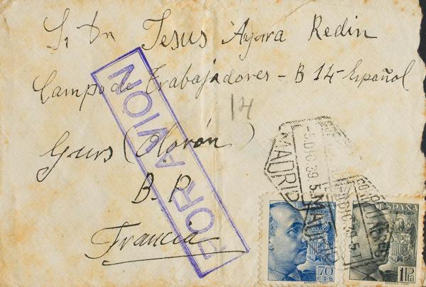 874, 875. 1939. 70 cts azul y 1 pts pizarra. MADRID a GURS (FRANCIA) (dirigida al campo de trabajadores de Gurs C.T.E.). BONITA Y RARA CON DESTINO A UN CAMPO DE REFUGIADOS.