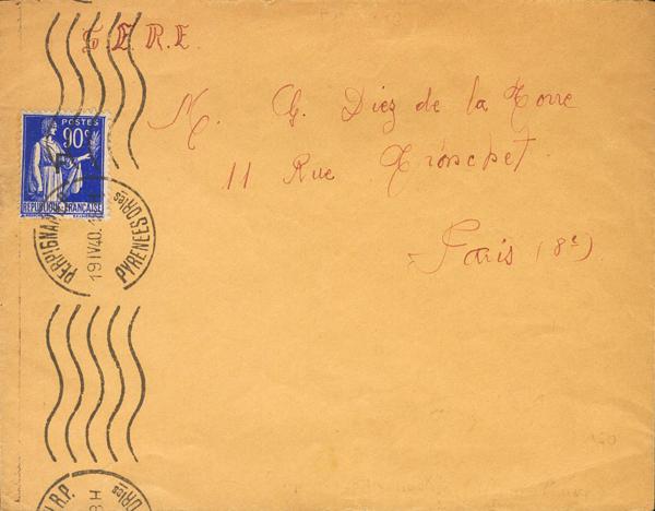 1940. PERPIÑAN a PARIS, probablemente escrita desde alguno de los Campos de Refugiados próximos. Matasello PERPIGNAN R.P. / PYRENEES ORLES y manuscrito F.M. MAGNIFICA.