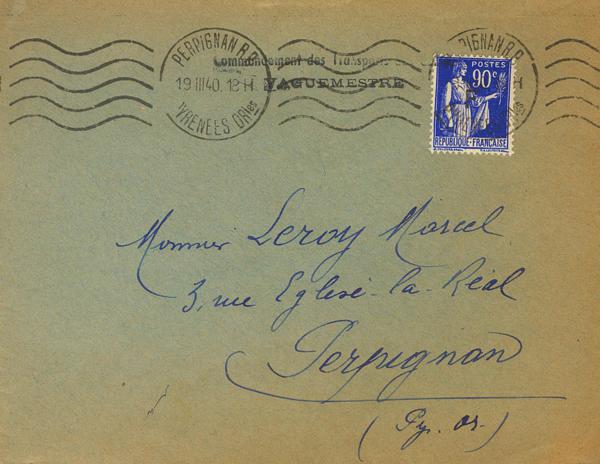 1940. 90 cts azul de Francia con sobrecarga "F". Correo Interior de PERPIGNAN, muy probablemente remitida por un español refugiado. En el frente marca COMMANDEMENT DES TRANSPORTS... / LE VAGUEMESTRE. MAGNIFICA.