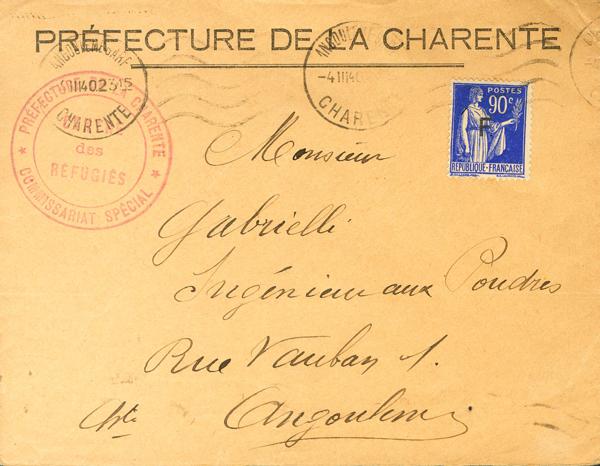 1940. 90 cts azul de Francia, sobrecarga F. Correo Interior de ANGOULEME, muy probablemente remitida desde el "Campo de Alliers", que se utilizó hasta septiembre de 1940, para internar a refugiados españoles. En el frente marca PREFECTURE DE LA CHARENTE / CENTRE / DES / REFUGIES / COMMISSARIAT SPECIAL, al dorso llegada. MAGNIFICA Y RARA.
