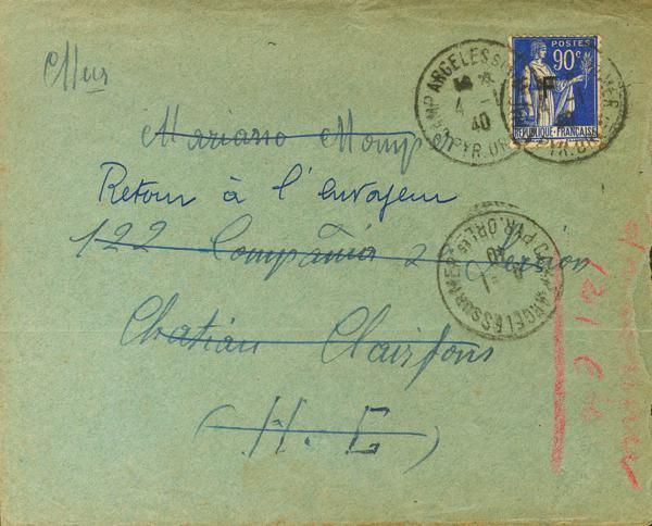 1940. 90 cts azul de Francia, sobrecarga F. ARGELES SUR MER a CHATIAN CLAIRFONS, remitida por un refugiado español en el Campo de Argeles Sur Mer y dirigida a un español de la 122ª CompañÃa de Trabajadores Españoles y devuelta al remitente, muy probablemente por error en el destino. MAGNIFICA Y RARA.