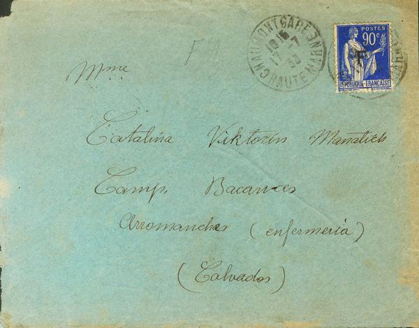 1939. 90 cts azul de Francia, sobrecarga F. CHAUMONT a ARROMANCHES, remitida por una refugiada española internada en un Alojamiento Temporal en Chaumont y dirigida a "Camp Bacances" en Arromanches. MAGNIFICA.