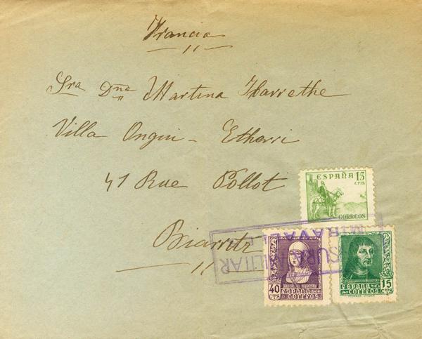 857, 858, 817. 1939. 30 cts rosa, 40 cts violeta y 10 cts verde. ALEGRIA DE ORIA (GUIPUZCOA) a BIARRITZ (FRANCIA). En el frente marca CENSURA MILITAR / ALEGRIA DE ORIA, al dorso llegada. MAGNIFICA Y MUY RARA.