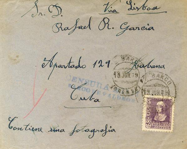 858. 1939. 40 cts violeta. BARCO DE VALDEORRAS (ORENSE) a LA HABANA (CUBA). En el frente marca CENSURA MILITAR / BARCO DE VALDEORRAS, en azul. MAGNIFICA.