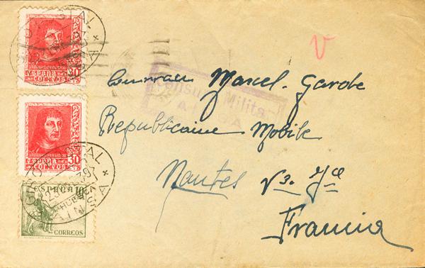 844(2), 817. 1939. 30 cts rojo, dos sellos y 10 cts verde. ESPIERBA (HUESCA) a NANTES (FRANCIA). Matasello GIRO POSTAL / HUESCA / AINSA y en el frente marca CENSURA MILITAR / AINSA, en violeta y al dorso llegada. MAGNIFICA Y MUY RARA, NO RESEÑADA.