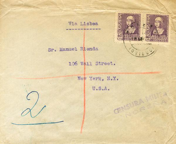858(2). 1939. 40 cts violeta oscuro, dos sellos. Certificado de NOREÑA (ASTURIAS) a NUEVA YORK (U.S.A.). En el frente marca CENSURA MILITAR / NOREÑA, en violeta y al dorso llegada. MAGNIFICA Y MUY RARA.