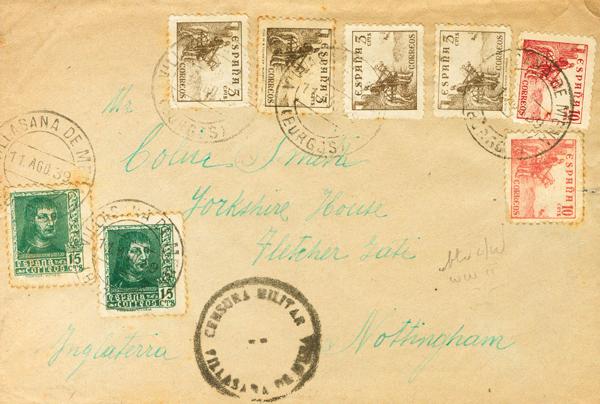 841(2), 816(2), 816B(2), 818. 1939. 15 cts verde, dos sellos, 5 cts castaño, cuatro sellos (dos sin pie de imprenta) y 10 cts rosa, dos sellos. VILLASANA DE MENA (BURGOS) a NOTTINGHAM (GRAN BRETAÑA). En el frente marca CENSURA MILITAR / VILLASANA DE MENA, en negro. MAGNIFICA Y RARA.