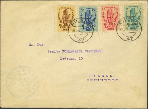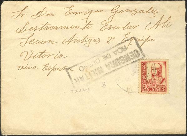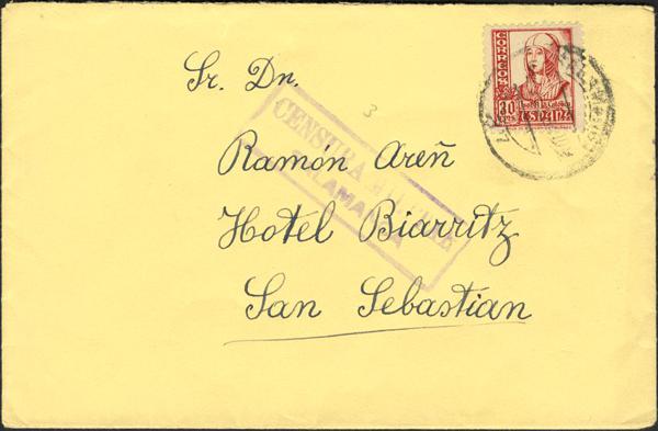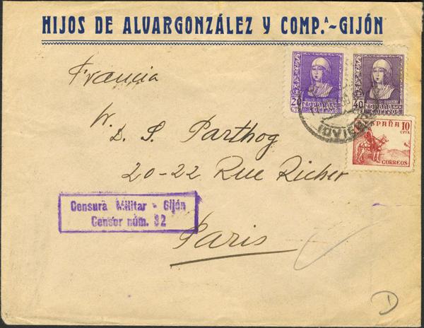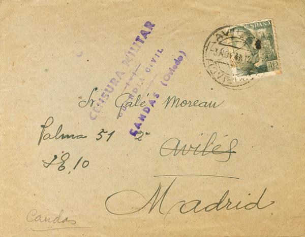 925. 1941. 40 cts verde gris. CANDAS (ASTURIAS) a AVILES, reexpedida a MADRID. En el frente marca CENSURA MILITAR / GUARDIA CIVIL / CANDAS (OVIEDO), en violeta y al dorso llegada. MAGNIFICA Y MUY RARA.