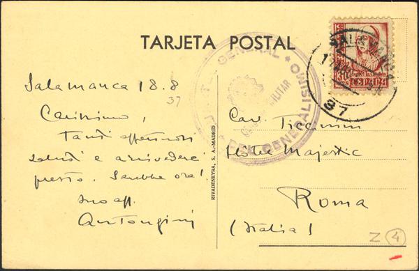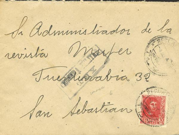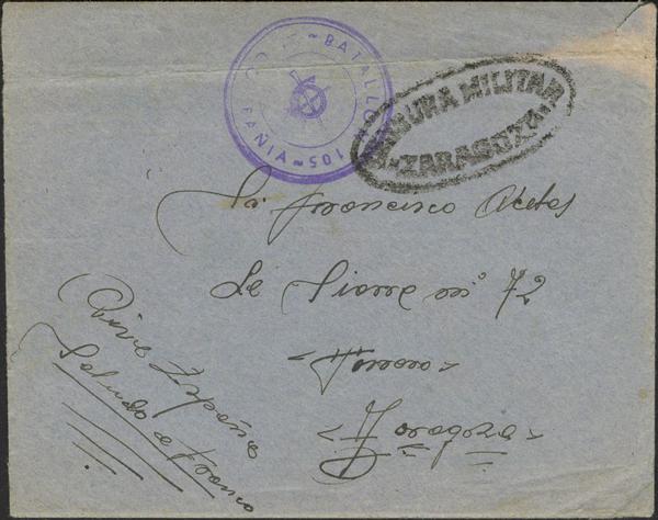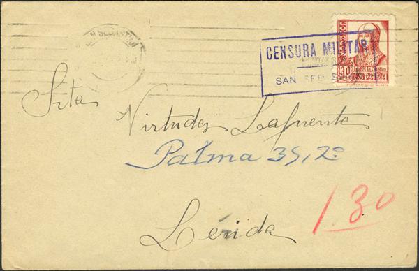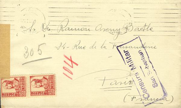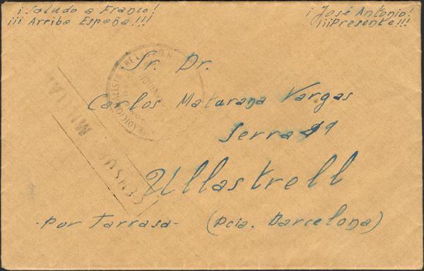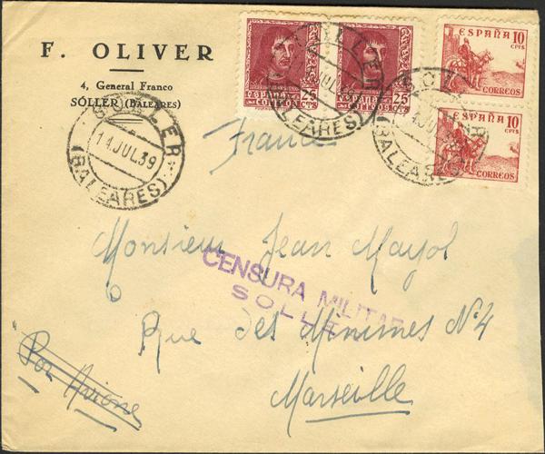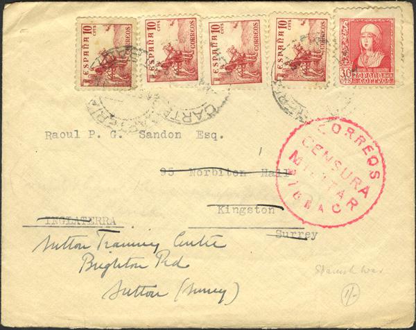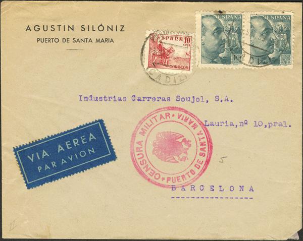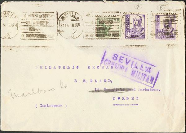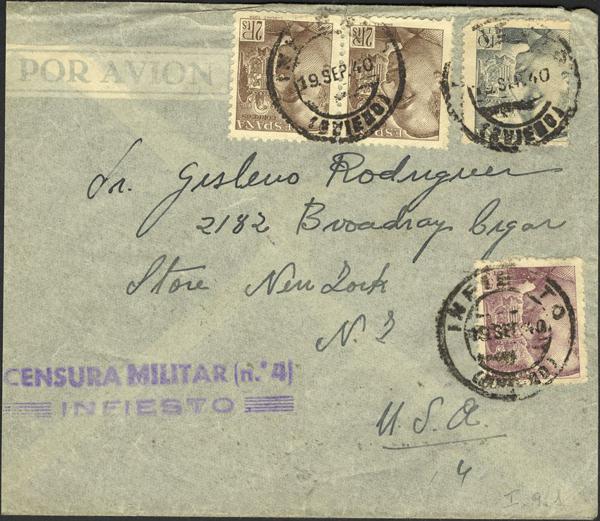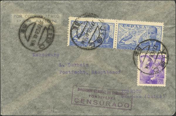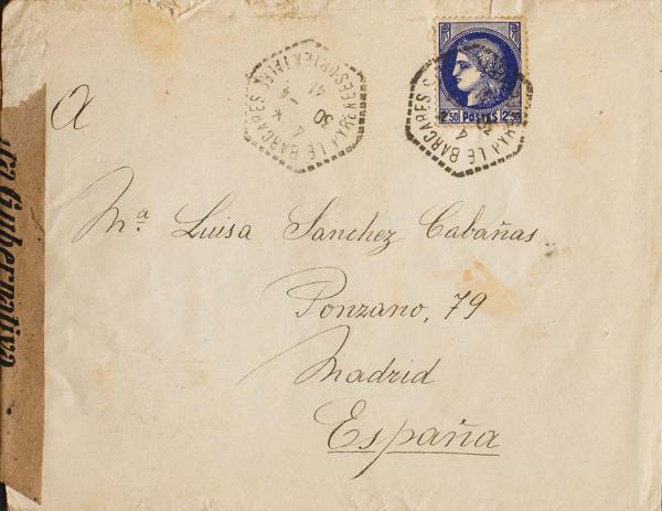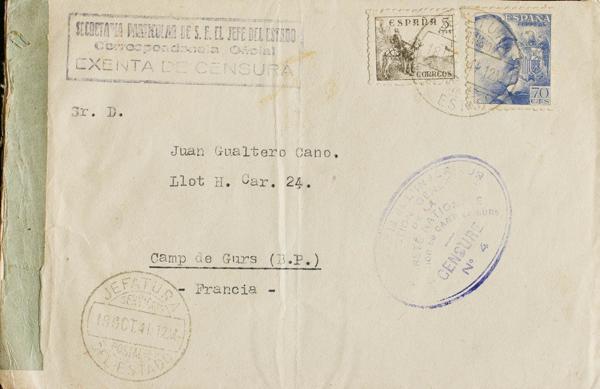 1941. 70 cts azul y 5 cts sepia. MADRID a GURS (remitida desde la SecretarÃa Particular de S.E. el Jefe del Estado y dirigida al Campo de Refugiados de Gurs a Juan Gualtero Cano, un ex oficial republicano que al salir del campo de Gurs emigró a Monterrey en Méjico donde se dedicó al comercio filatélico). En el frente marca MINISTERE DE L´INTERIEUR / DIRECTON GENERALE / DE LA SURETE NATIONALE / DIRECTION DU CAMP DE GURS / CENSURE / Nº4, en violeta. MAGNIFICA Y MUY RARA.