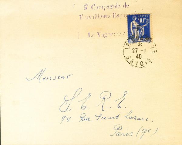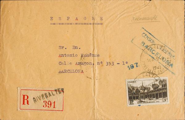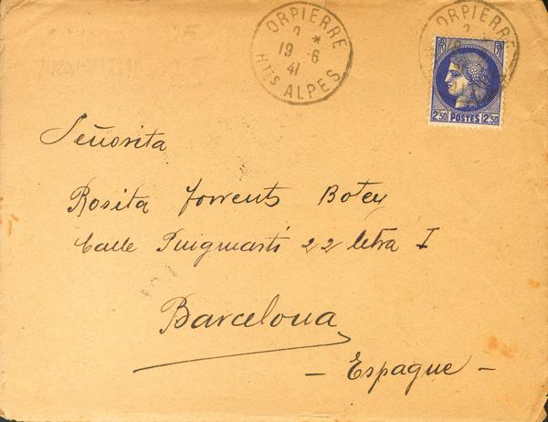 1941. 2´50 f azul de Francia. Carta (con texto) de ORPIERRE a BARCELONA, remitida por un enfermero español del 95º Grupo de Trabajadores Españoles, establecido en esta pequeña localidad del departamento de Altos Alpes. MAGNIFICA Y RARA.