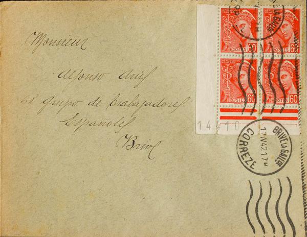 1942. 60 cts naranja, bloque de cuatro. CORREZE a BRIVE (dirigida a un español del Grupo de Trabajadores Extranjeros Nº68). MAGNIFICA Y RARA.