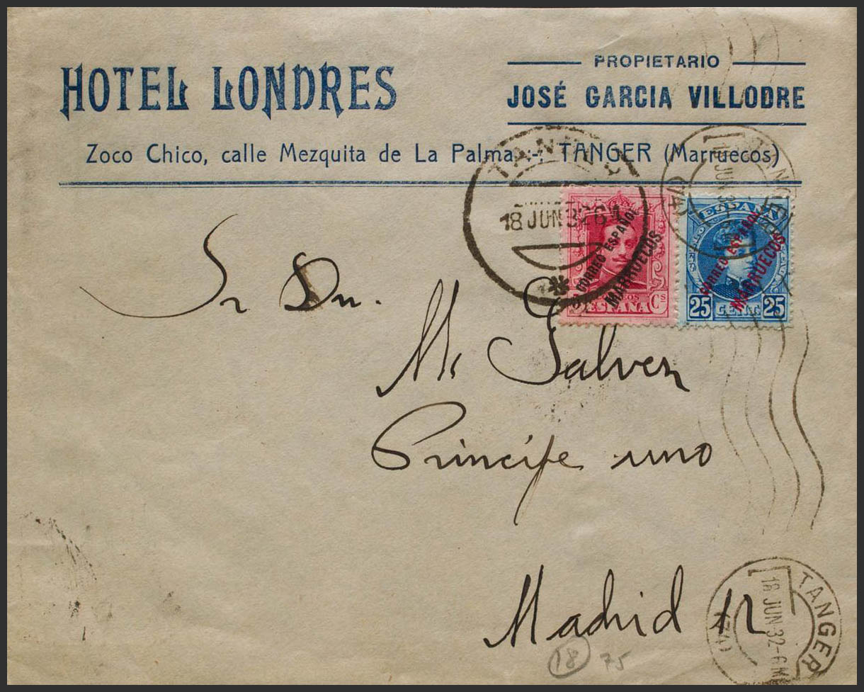 7, Tánger 19. 1932. 25 cts azul y 5 cts carmín de Tánger. TANGER a MADRID. Al dorso llegada. MAGNIFICA E INUSUAL FRANQUEO.