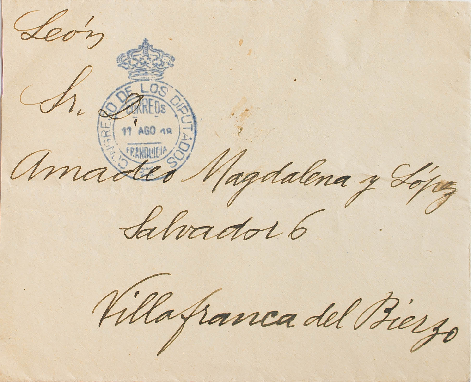 1918. MADRID a VILLAFRANCA DEL BIERZO. Circulada con franquicia CONGRESO DE LOS DIPUTADOS / CORREOS / FRANQUICIA, al dorso llegada. MAGNIFICA.