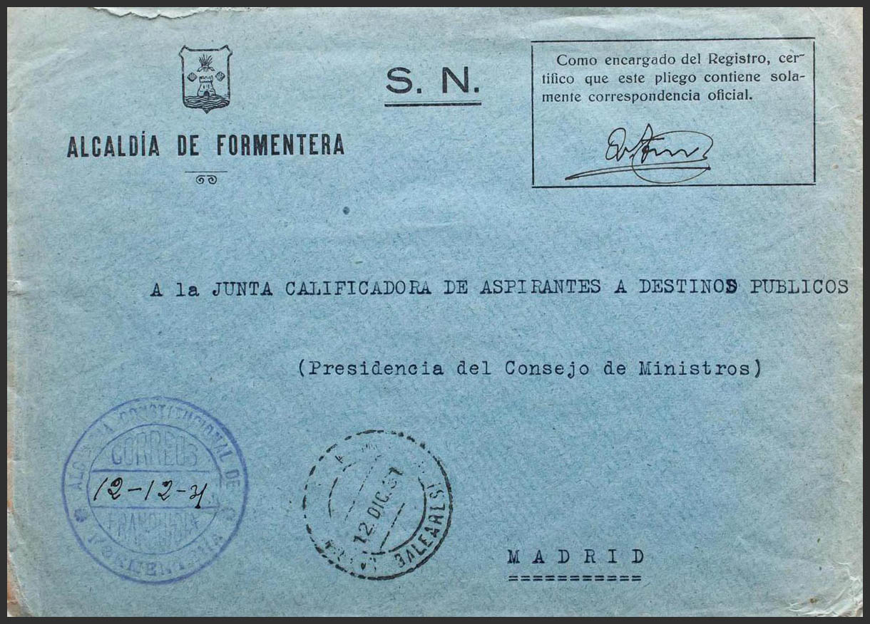 Franquicia. FORMENTERA / BALEARES, al dorso tránsito. MAGNIFICA.