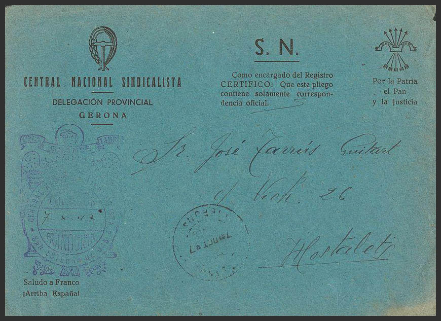 Franquicia. CENTRAL NACIONAL SINDICALISTA / CORREOS / FRANQUICIA / SAN ESTEBAN DE SAS. MAGNIFICA.