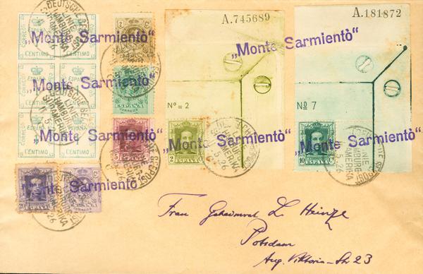 310,311,314,316,291(6),267/68. 1926. 2 cts verde bronce, 5 cts lila, 10 cts verde, 20 cts violeta, 1 cts verde, seis sellos y tres sellos de 2 cts, 5 cts y 20 cts de Medallón. Dirigida a POTSDAM (ALEMANIA). Matasello MONTE SARMIENTO, en violeta (nombre del buque de la Norddeutscher Lloyd que realizaba la ruta hacia Argentina) y fechador DEUTSCHE SEE POST / LINIE / HAMBURG- / SUDAMERIKA. MAGNIFICA Y RARA, MUY ESPECTACULAR.