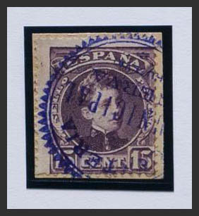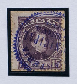 245. 1901. 15 cts lila castaño. Matasello CARTERIA / MUNICIPAL / NERVA / HUELVA, en violeta. MAGNIFICO Y RARO, NO RESEÑADO.