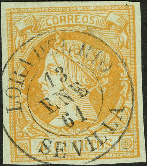 52. 1860. 4 cuartos amarillo. Matasello LORA DEL RIO / SEVILLA. LUJO.