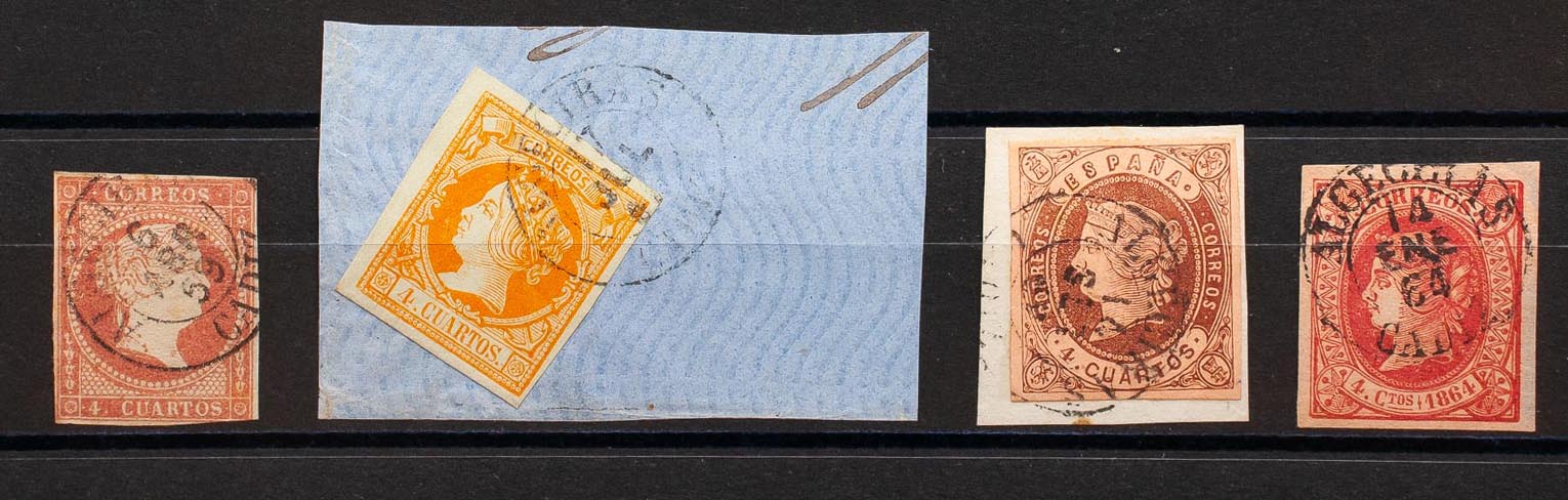 48, 52, 58, 64. (1855ca). Conjunto de cuatro sellos del 4 cuartos rojo, amarillo, castaño y rosa, inutilizados con el matasello ALGECIRAS / CADIZ (Tipo I). MAGNIFICO Y MUY RARO.