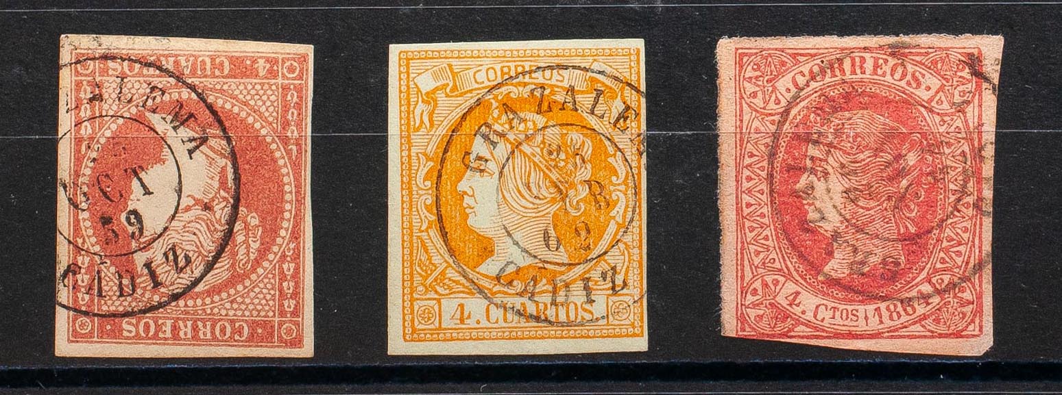 48, 52, 64. (1855ca). Conjunto de tres sellos del 4 cuartos rojo, amarillo y rosa, inutilizados con matasello GRAZALEMA / CADIZ. MAGNIFICO.