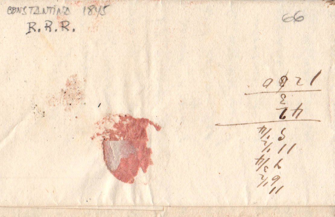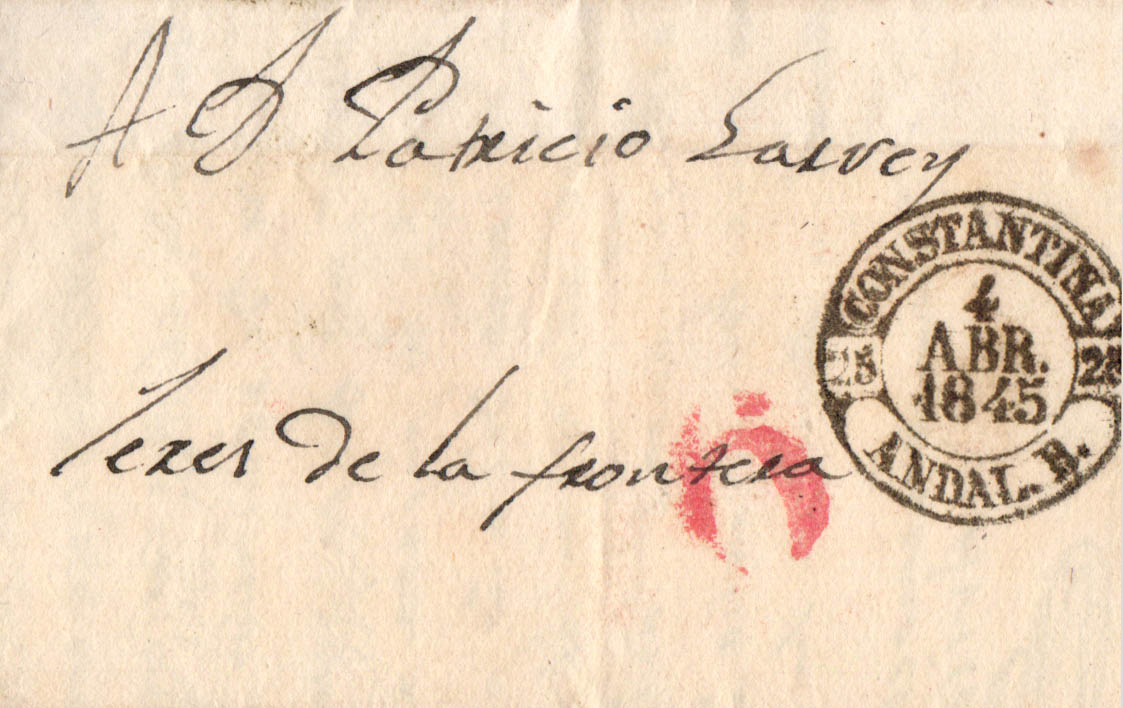 1845. CONSTANTINA (SEVILLA) a JEREZ DE LA FRONTERA. Baeza CONSTANTINA / ANDAL.B., en negro. MAGNIFICA Y RARISIMA, ESPECIALMENTE CON ESTA ESPECTACULAR ESTAMPACION.