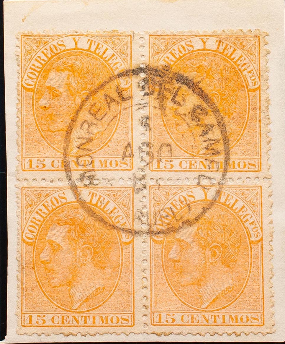 210(4). 1882. 15 cts naranja, bloque de cuatro. Matasello trébol MONREAL DEL CAMPO / (TERUEL). MAGNIFICO.