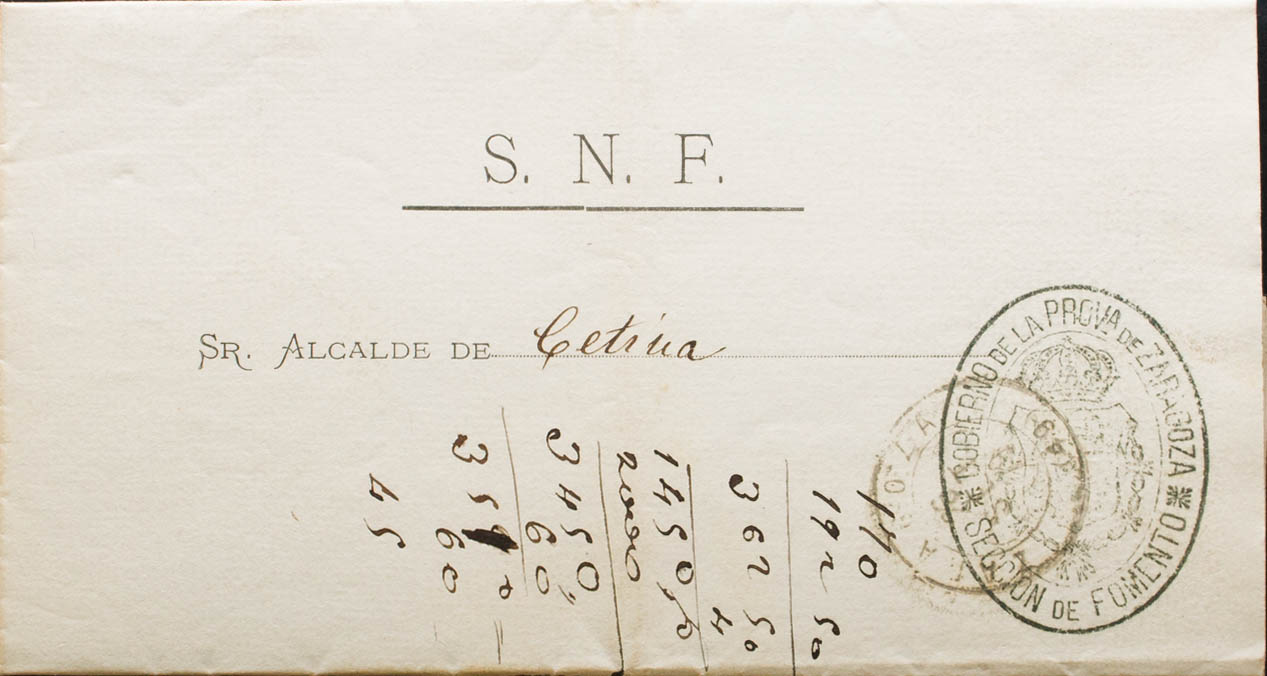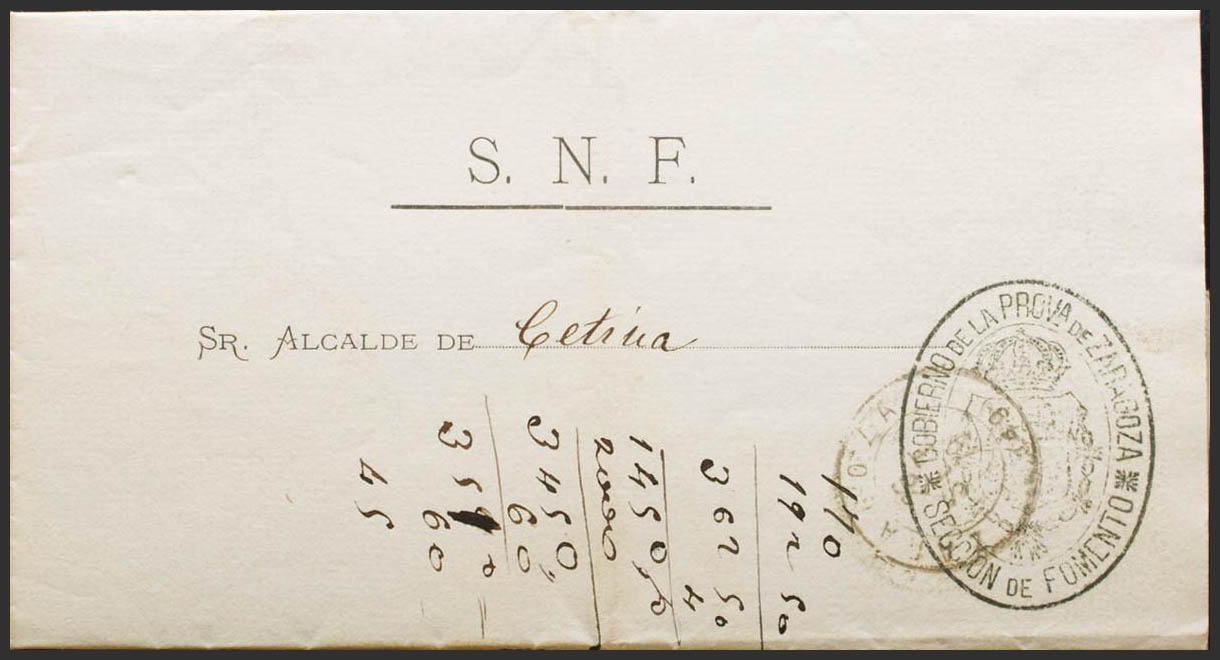 Aragón. Historia Postal. Marca GOBIERNO DE LA PROVª DE ZARAGOZA / SECCION DE FOMENTO. MAGNIFICA.