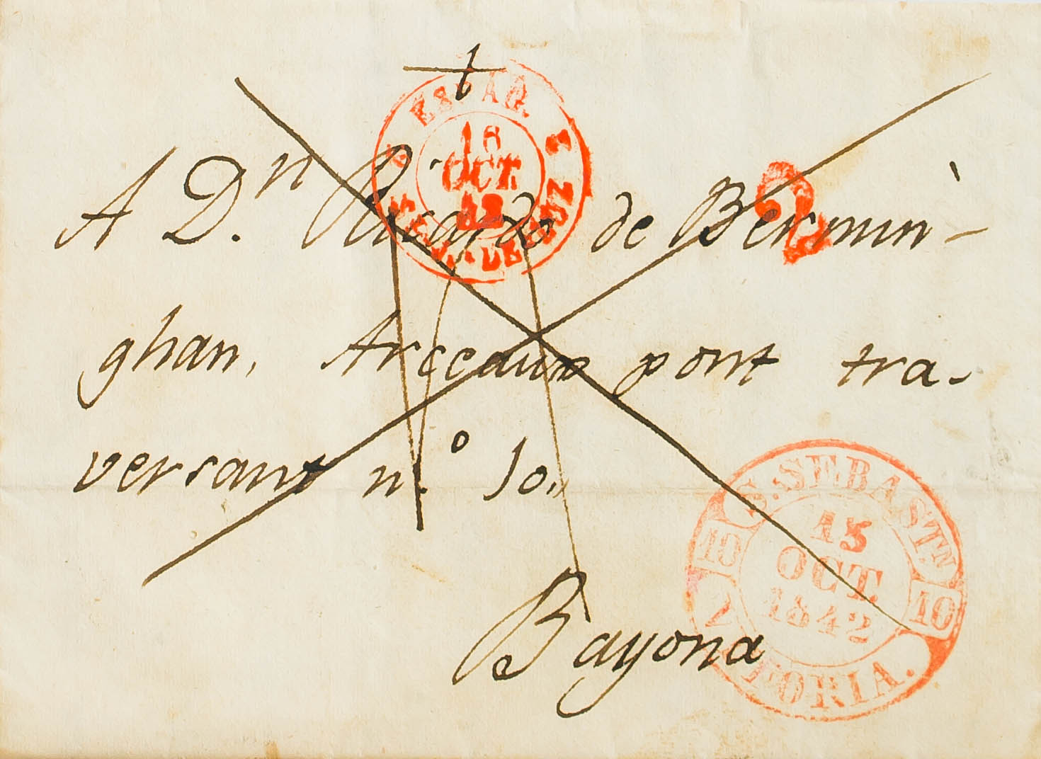 1842. ZARAUTZ a BAYONA (FRANCIA). Baeza S. SEBASTN. / VITORIA (P.E.27) edición 2004. MAGNIFICA Y RARISIMA, ESPECIALMENTE EN ESTA EXCEPCIONAL CALIDAD.