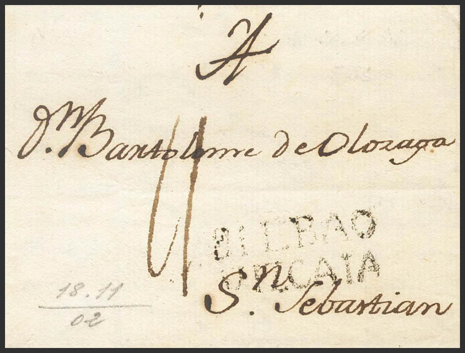 1802. BILBAO a SAN SEBASTIAN. Marca BILBAO / VIZCAYA, en negro (P.E.13) edición 2004. MAGNIFICA.