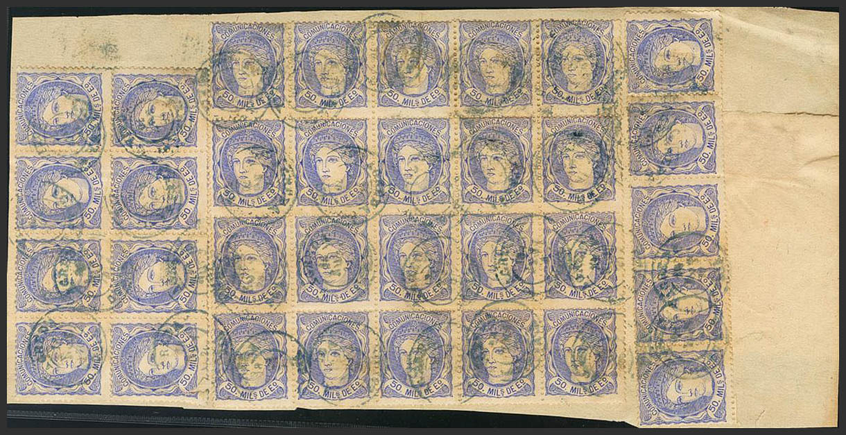 △ 107(32). 1870. 50 mils ultramar, treinta y tres sellos, sobre fragmento. Matasello AGREDA / SORIA, en azul. MAGNIFICO.