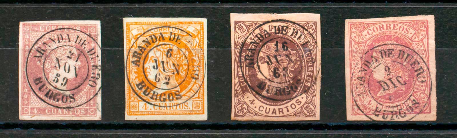 48, 52, 58, 64. (1855ca). Conjunto de cuatro sellos del 4 cuartos rojo, amarillo, castaño y rosa, inutilizados con el matasello ARANDA DE DUERO / BURGOS. MAGNIFICO.
